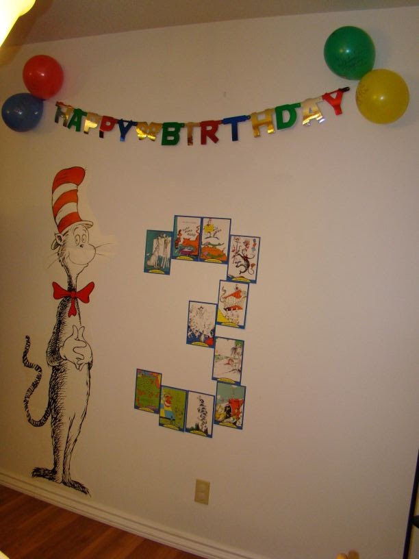 I used pictures from a Dr. Seuss trivia game to make a 3 on the wall and I found the Cat in the Hat at a craft store. The birthday banner came from the dollar store.
